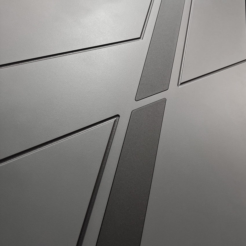 Внешняя панельФрезерованная МДФ 10 мм цвет Velluto Oscuro и вставкой из металла в цвет наличника (заподлицо)