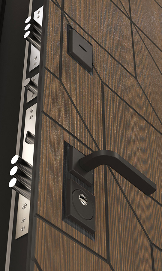 ФурнитураЧерная матовая: Броненакладка, сувальдные накладки со шторкой, ручка, ночник, цилиндр ключ-вертушка (производитель не регламентируется), глазок по центру или сбоку