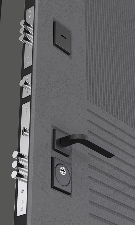 ФурнитураЧерная матовая: Броненакладка, сувальдные накладки со шторкой, ручка, ночник, цилиндр ключ-вертушка (производитель не регламентируется), глазок сбоку