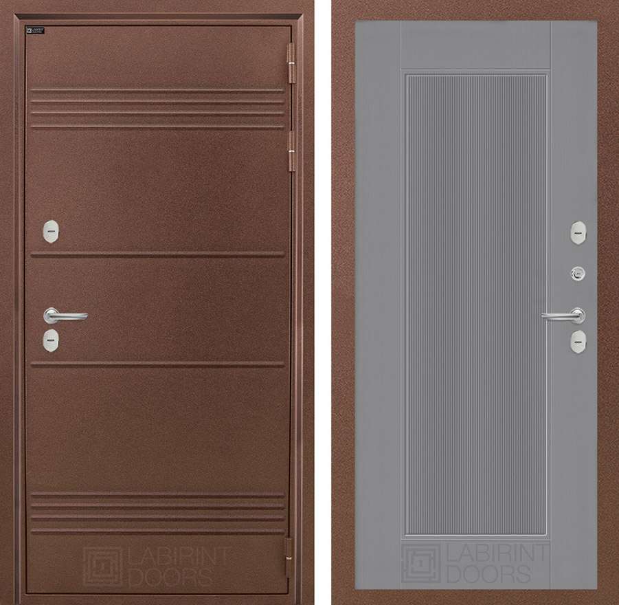 Внешняя отделка:Металлическая отделка с давлением Д44. Полимерное покрытие «Антик медный» с дополнительным цинковым грунтованием для защиты от коррозии. Фигурный наличник ФН-2