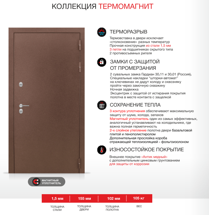 Толщина, вес:Полотно 102 мм, дверь 155 мм, вес 105 кг
