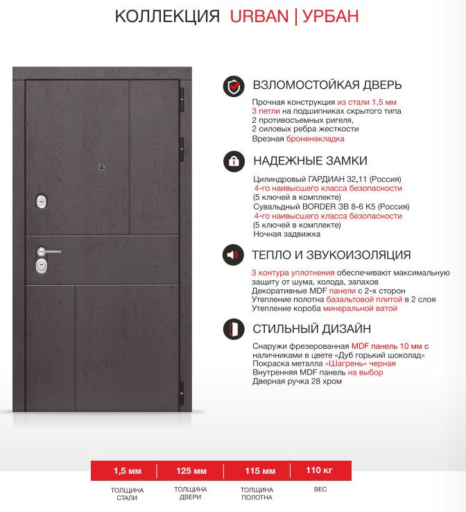 Толщина, вес:Полотно 115 мм, дверь 125 мм, вес 110 кг