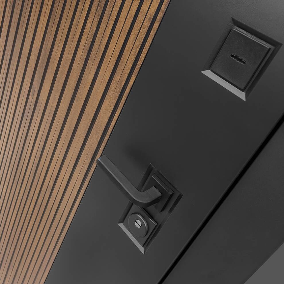Черная фурнитура (полимерная): накладки сувальдные со шторкой, накладка под цилиндр, дверная ручка, ночная задвижка, металлический эксцентрик с защитной вставкой.